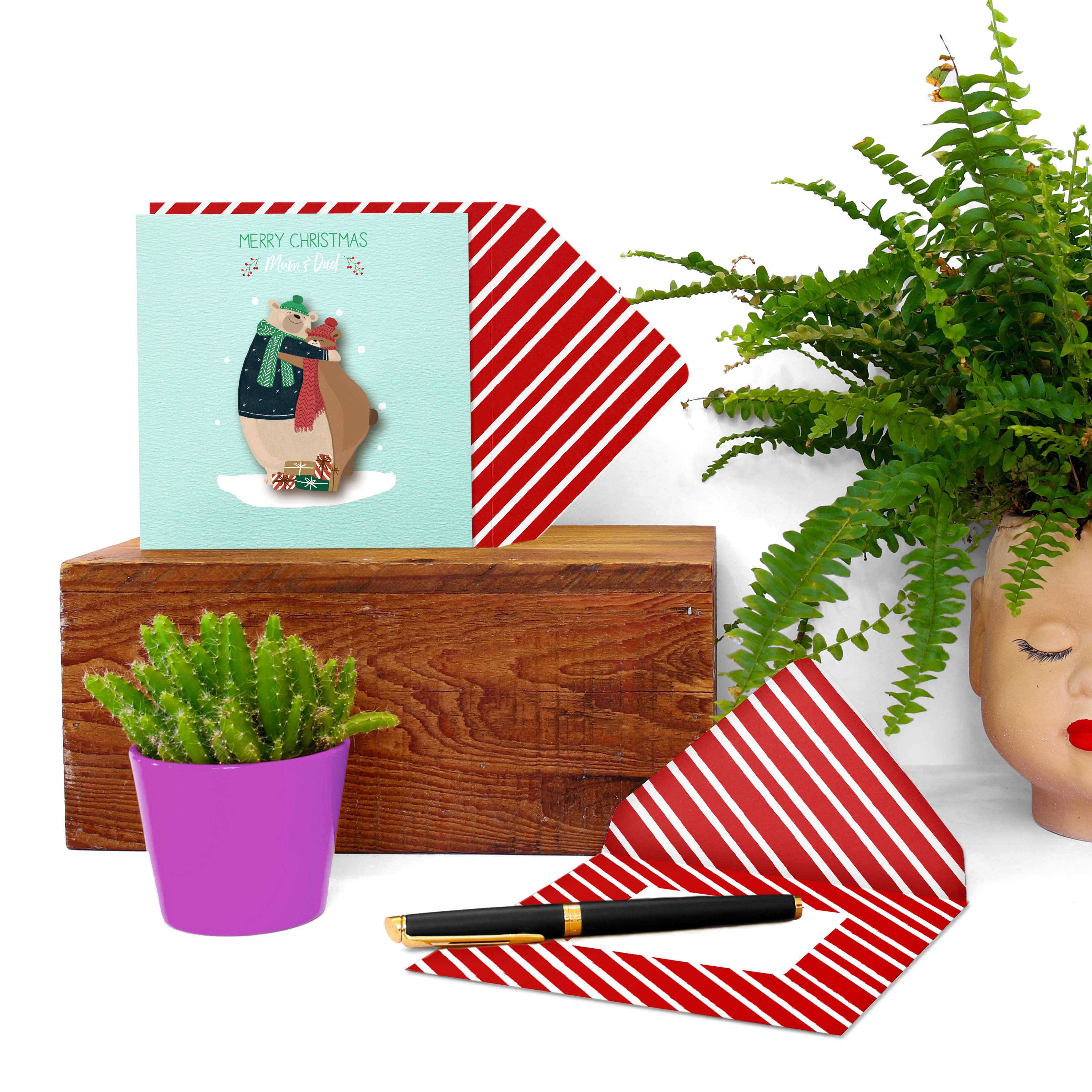 Printed on eco-friendly recycled board with soft pastel tones and paired with a classic red and white striped envelope, it’s the perfect way to say "Merry Christmas, Mum & Dad" in the most adorable way.