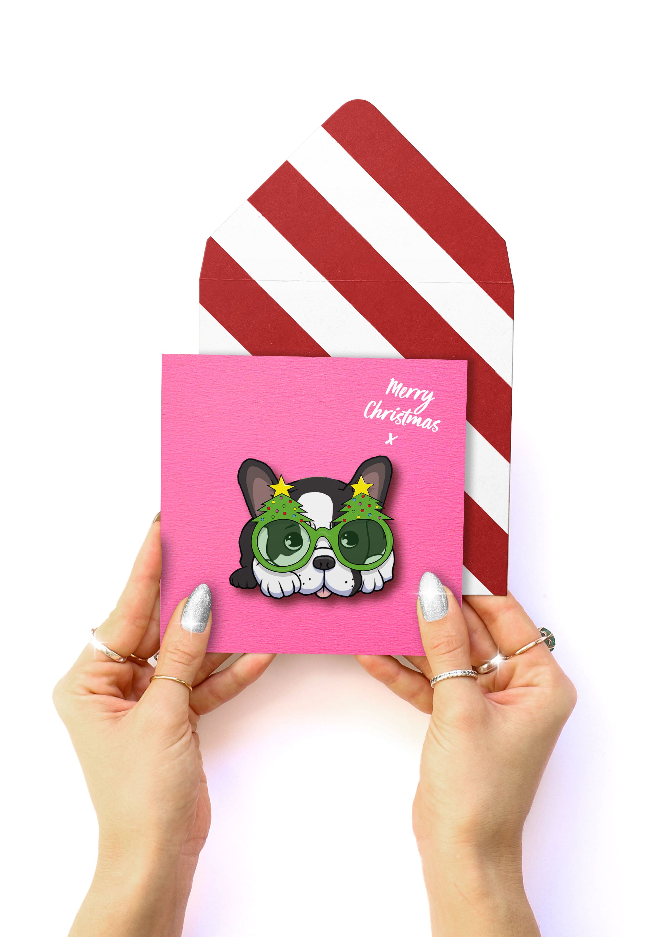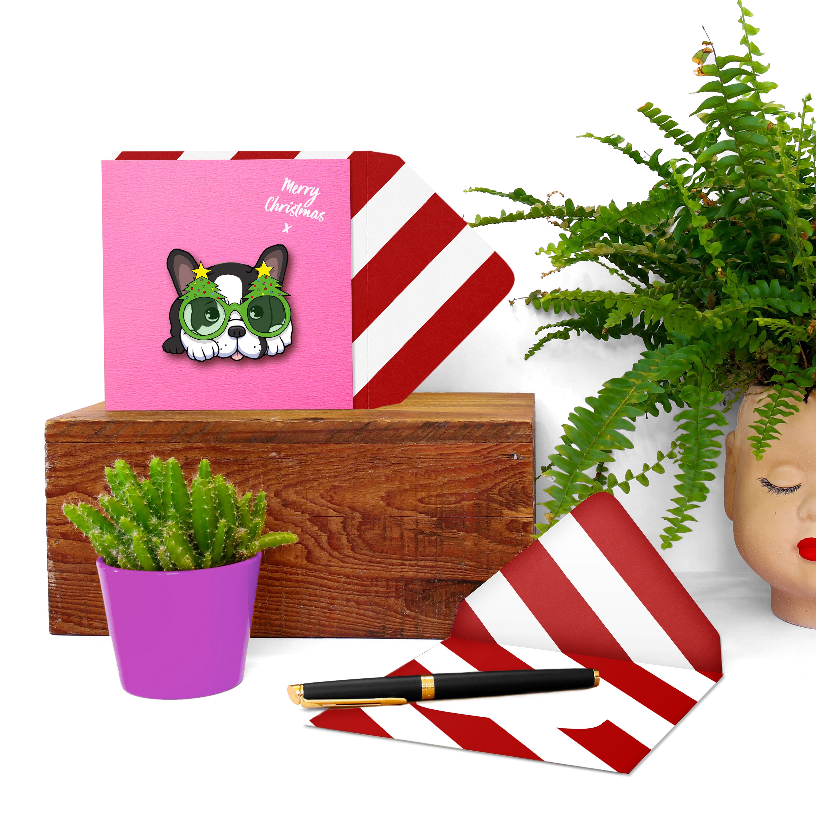 Printed on eco-friendly recycled board and paired with a bold red and white striped envelope, it’s the perfect Christmas card for dog lovers, Frenchie fans, and anyone who appreciates a little holiday humour.