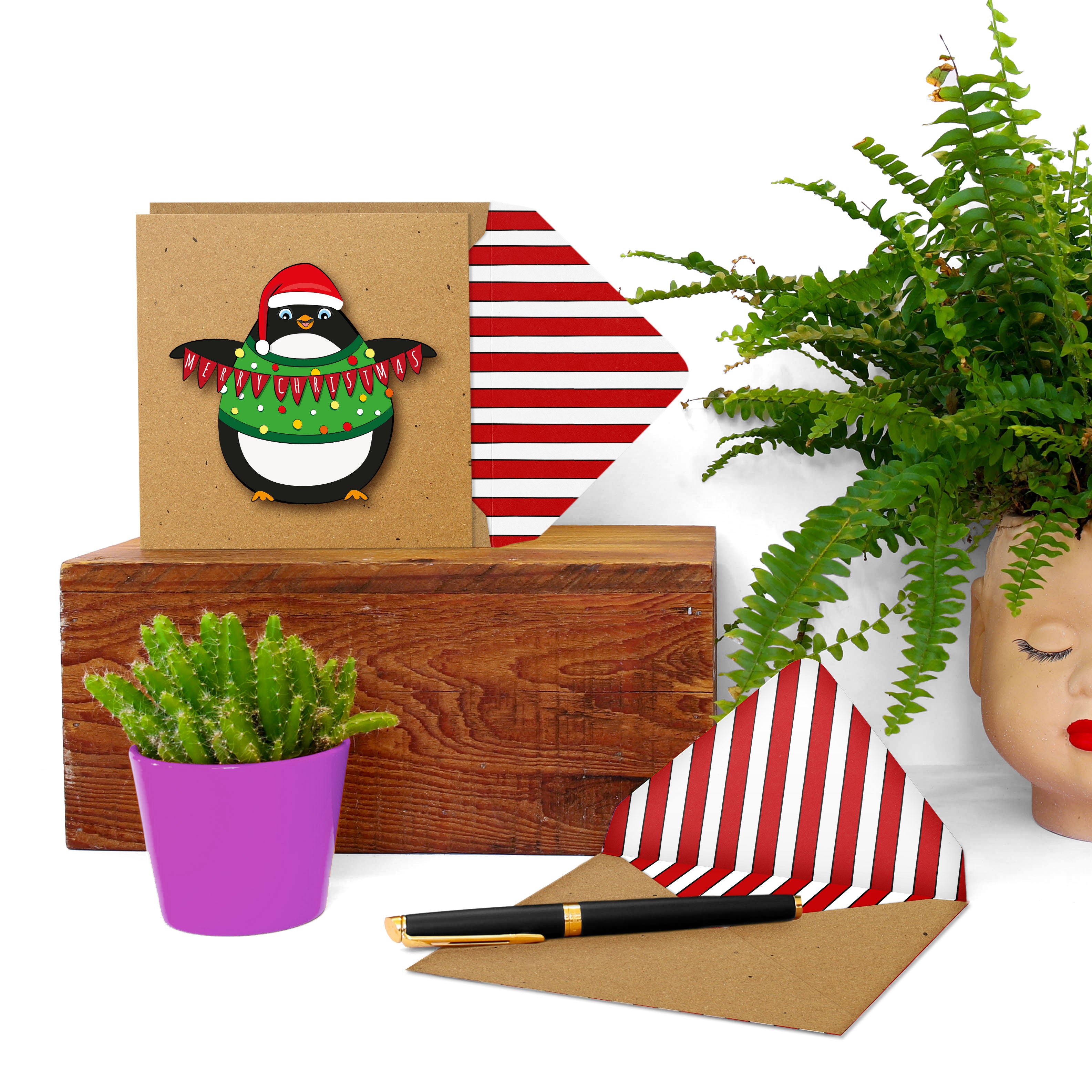 Printed on eco-friendly recycled kraft board and paired with a bold red and white striped envelope, it’s the perfect card for penguin lovers, families, and anyone who loves a cheerful Christmas surprise.