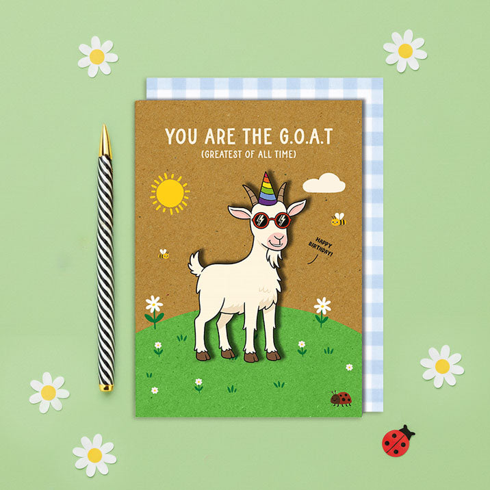 Bring a bit of farmyard fun to the birthday aisle with this handmade 3D goat greeting card! Featuring a goat design and 'the greatest of all time' birthday sentiment, it’s perfect for retailers seeking everyday birthday cards with countryside personality. Crafted in the UK with quality paper and finished with a printed matching envelope, this blank-inside card is ready for personalised messages.